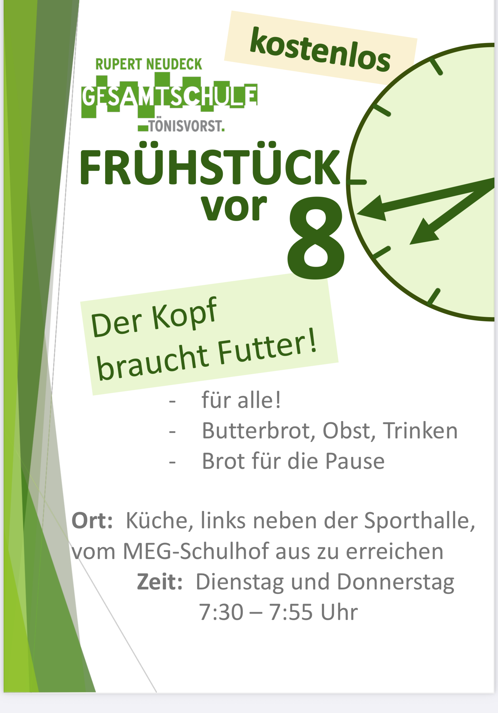 Seit den Herbstferien läuft das Frühstück vor 8 wieder an der RNG. Ungefähr 30 Schülerinnen und Schüler besuchen jeden Dienstag und Donnerstag das Frühstücksteam im Foyer der Corneliusfeld-Aula und nutzen dort die Zeit vor dem Gong für ein Frühstück und ein Schwätzchen. Die Meisten nehmen sich auch noch ein Pausenbrot mit.