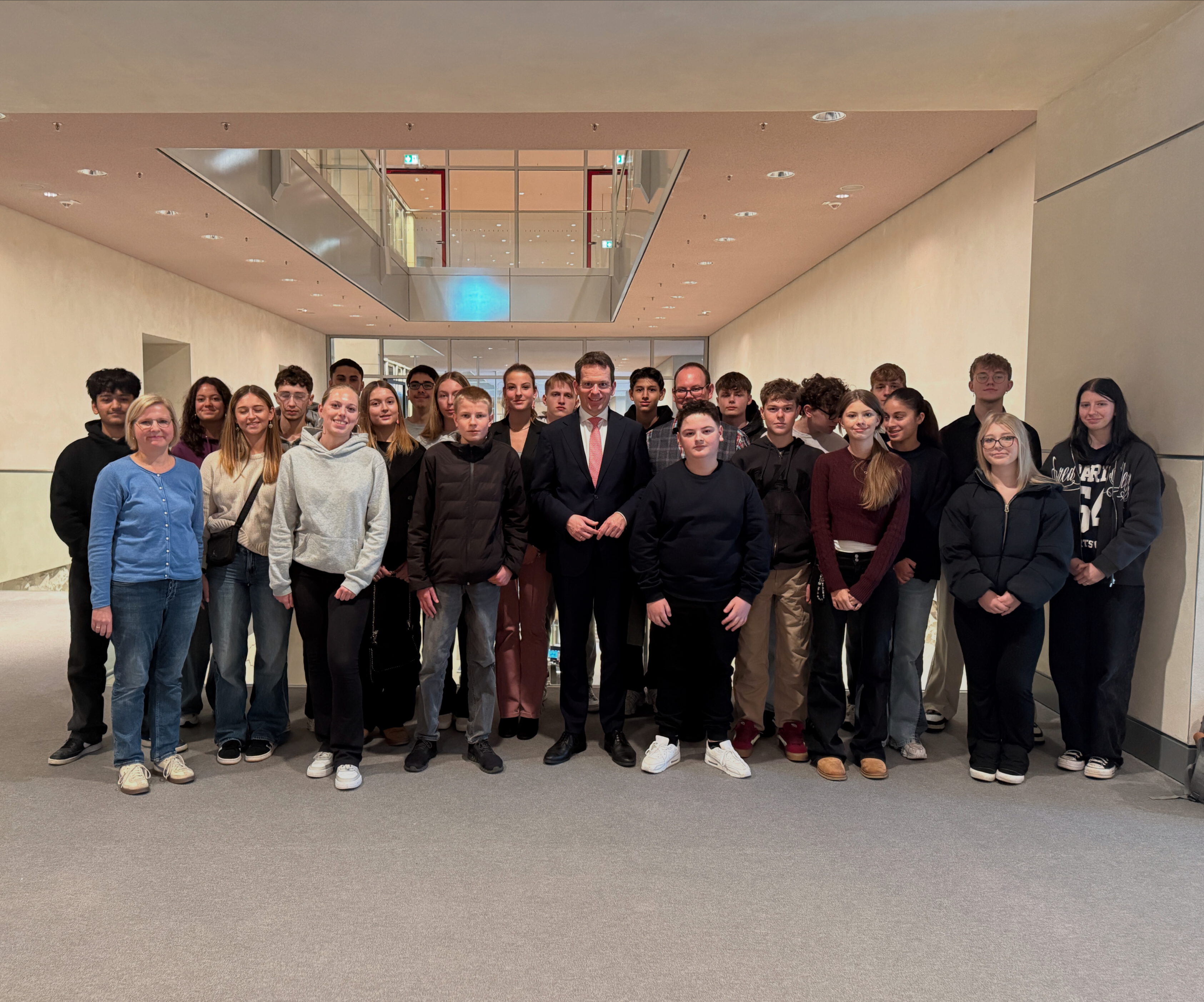 Anschließend trafen wir den Abgeordneten Herrn Dr. Martin Plum, der mit unserer Schule eine Partnerschaft pflegt. Er erzählte uns viel über seine Arbeit und sein Privatleben. Unsere Fragen beantworte er offen und freundlich. Zum Abschluss bekamen wir sogar ein kleines Andenken an das Treffen.